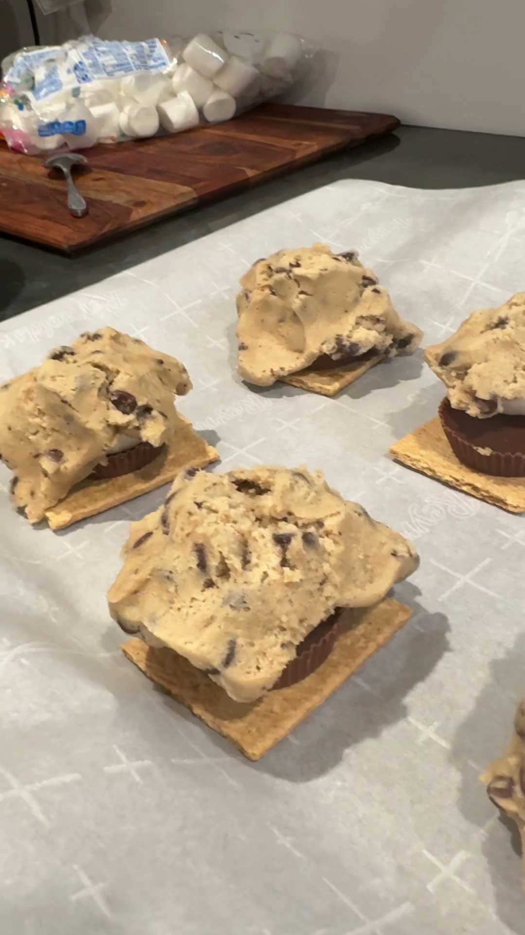 - Take a generous scoop of chocolate chip cookie dough and place it on top of the marshmallow. Make sure to cover it completely for maximum gooeyness!
