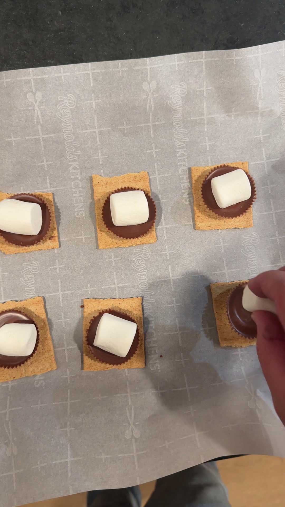 - Add a Reese’s Peanut Butter Cup on top of the Graham cracker.