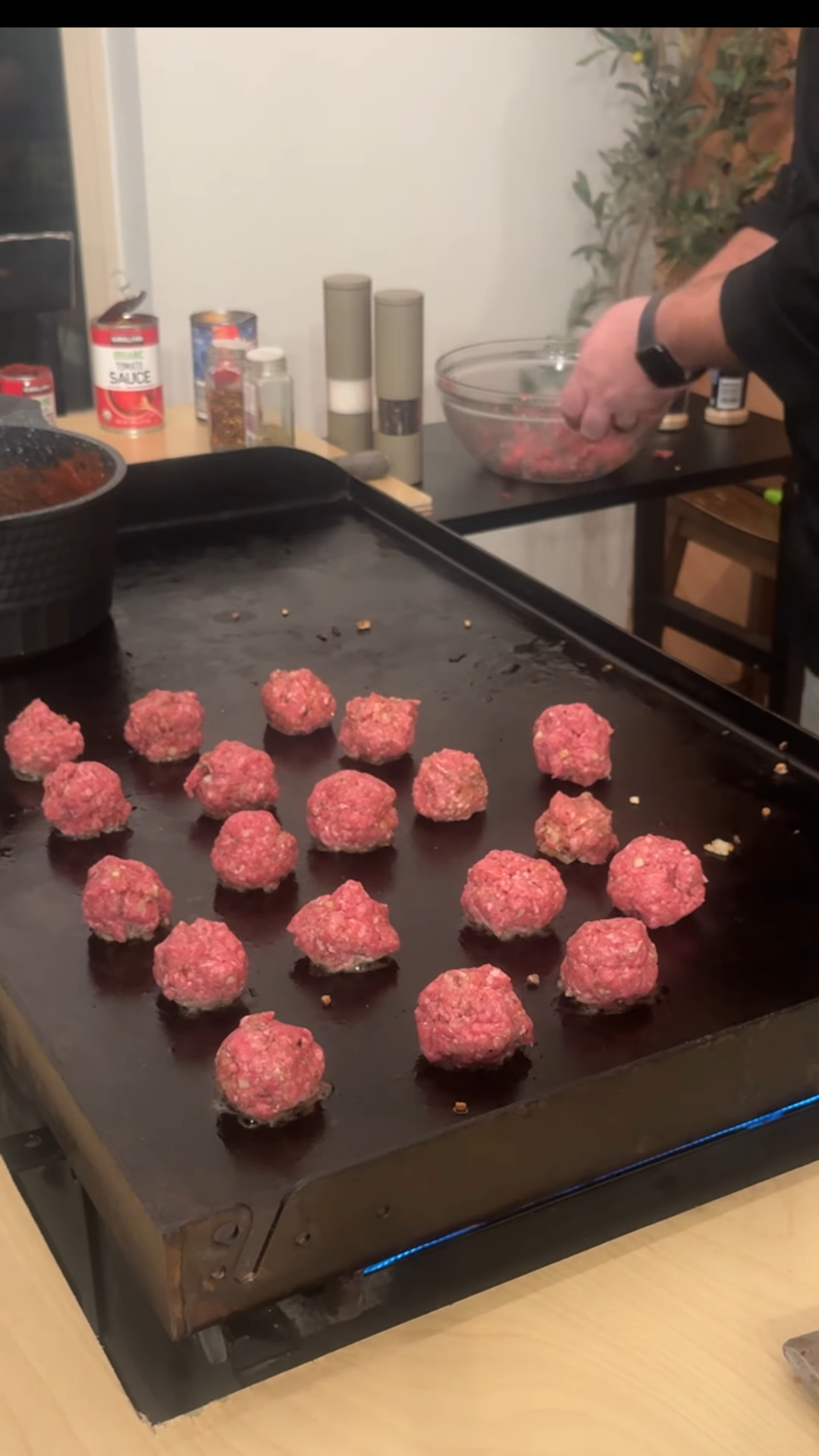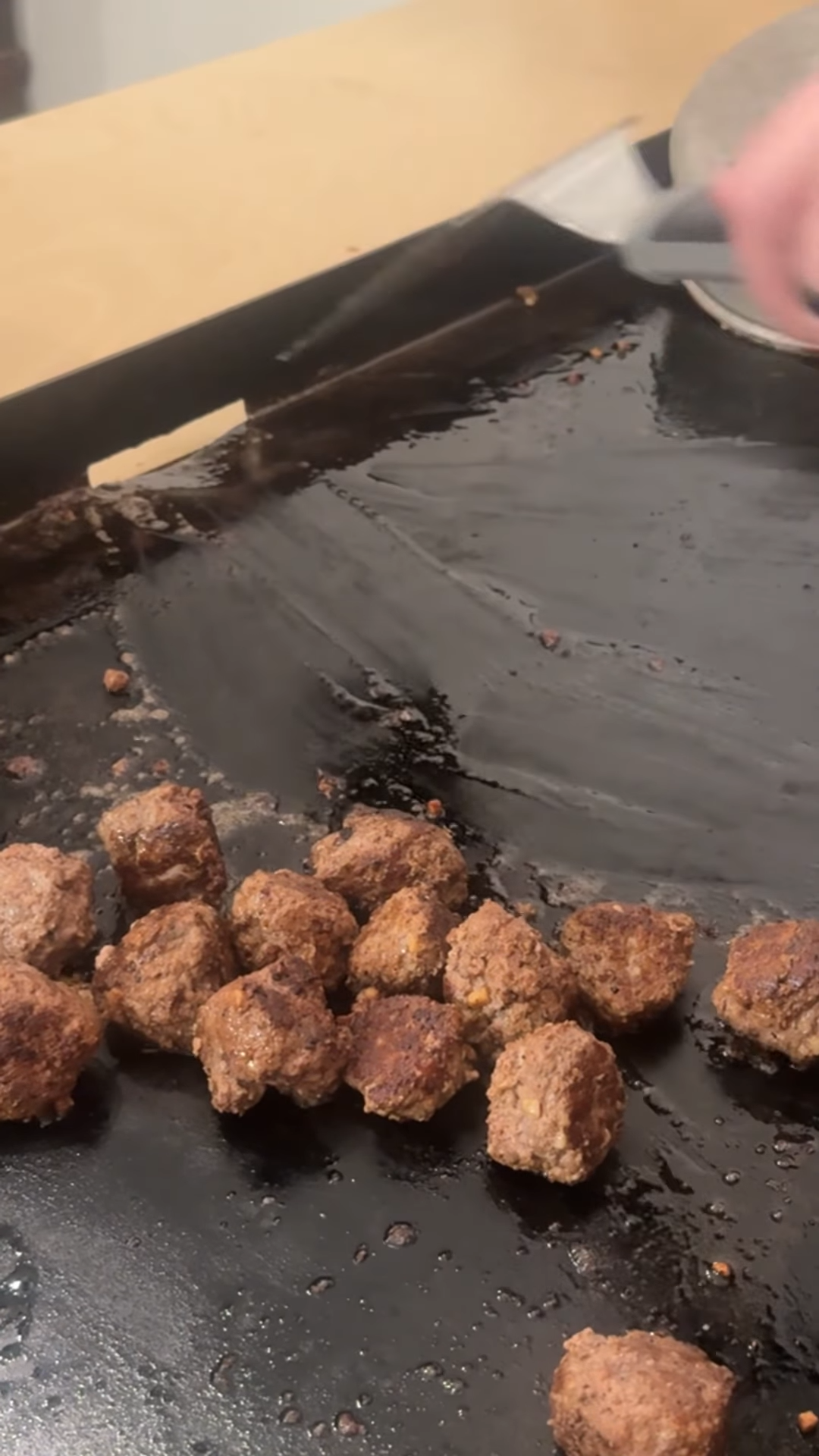 He melted butter with a bit of garlic and mixed it into the meat mixture for extra flavor and moisture. Once shaped, the meatballs were browned on the griddle until golden and fully cooked through.