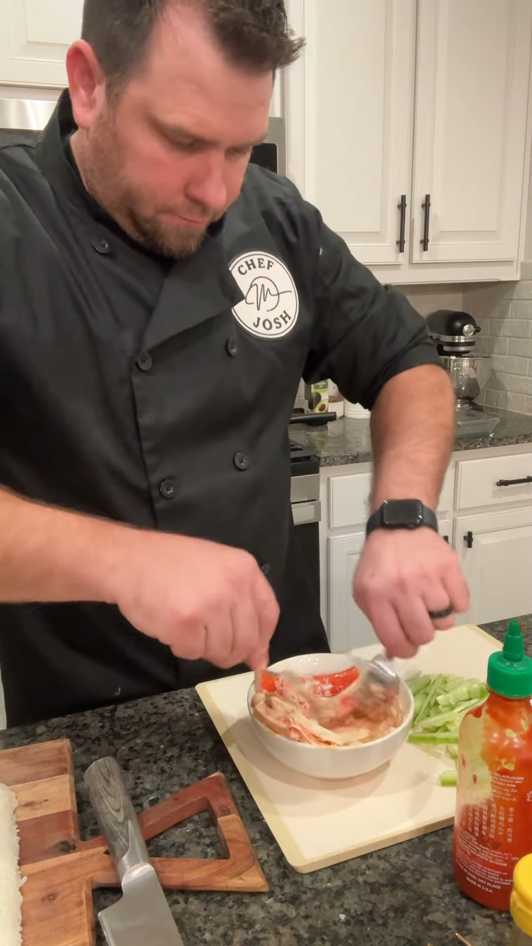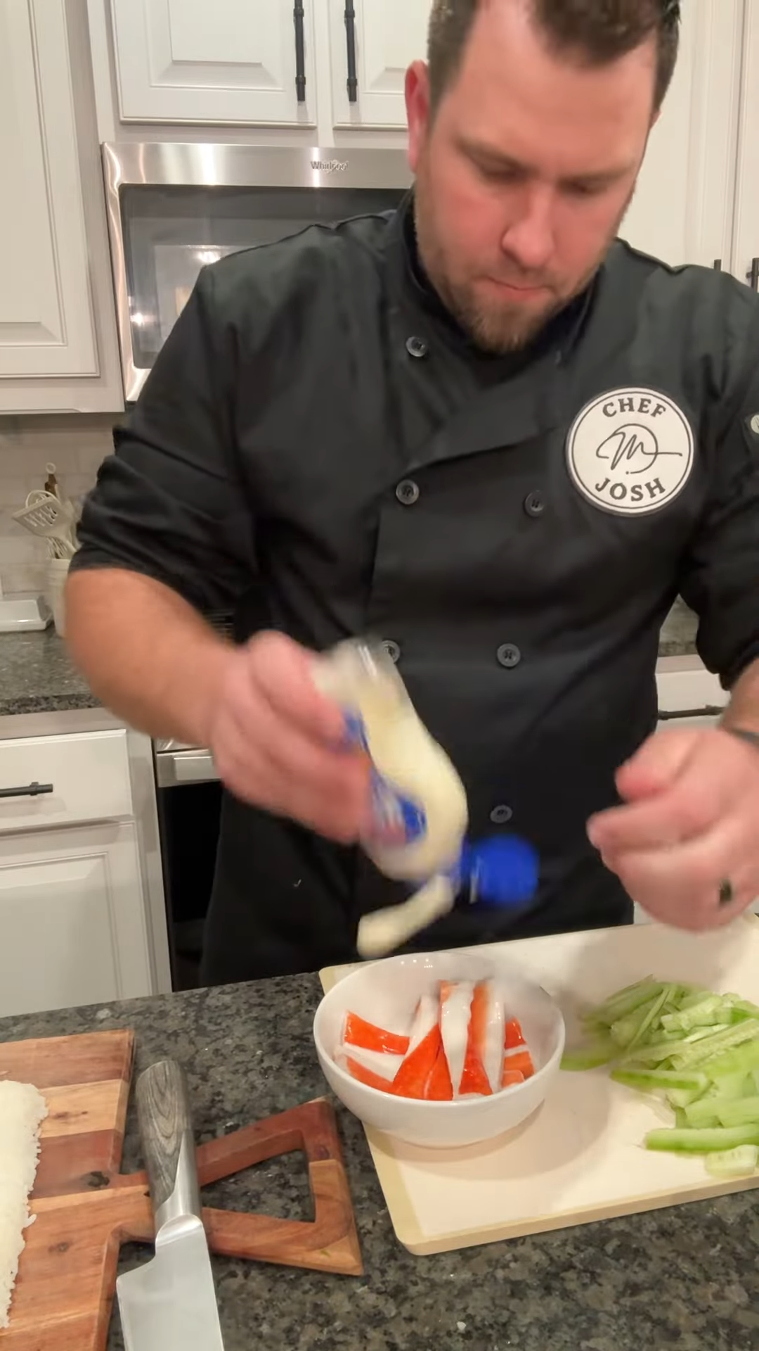 Mix the crab with mayonnaise, soy sauce, Sriracha, and sesame oil for flavor.