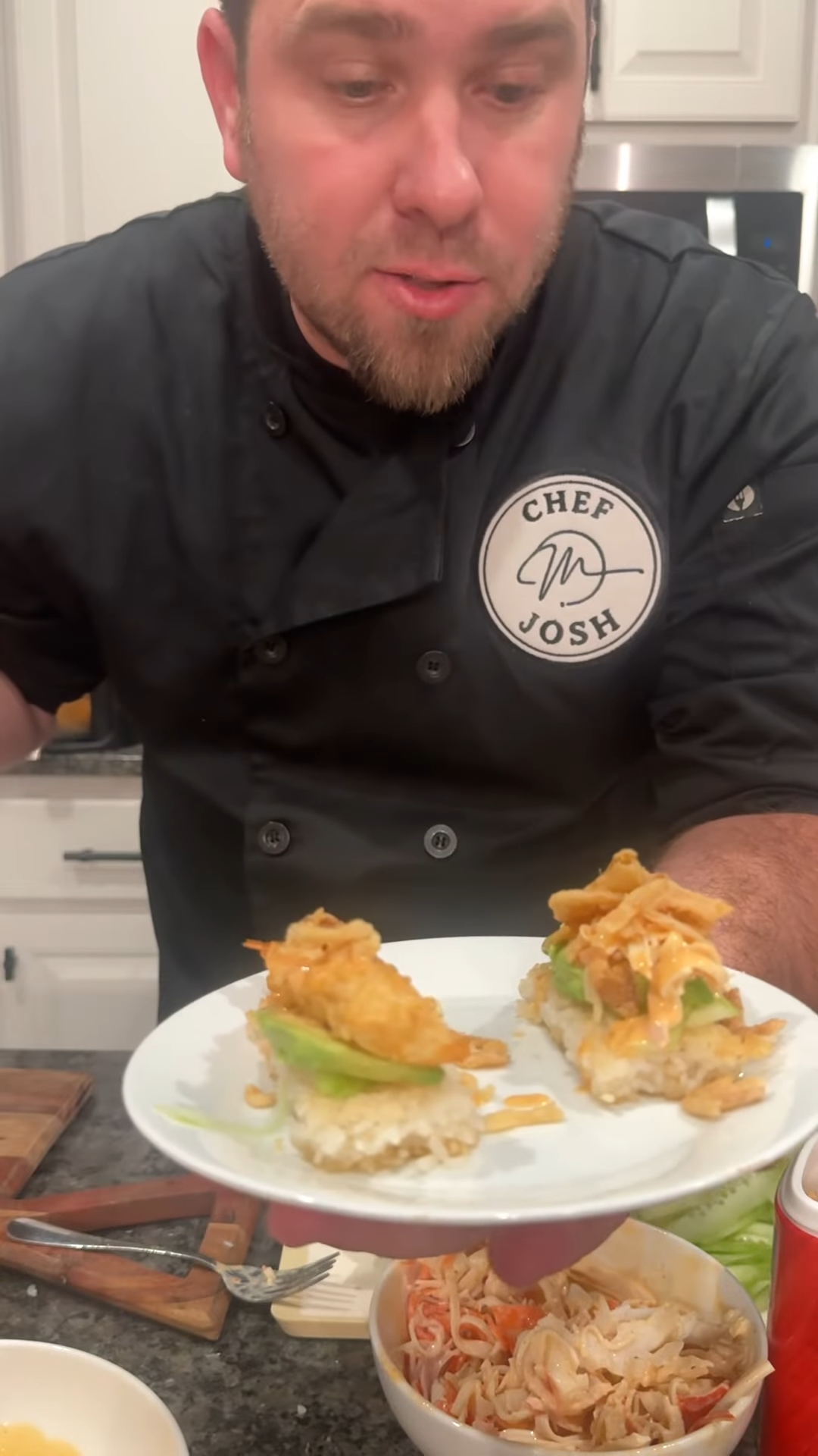 Lay out your rice base, then top with cucumber, avocado, and your crab mixture. If you made shrimp, add those on top. Finish with a drizzle of spicy mayo or teriyaki sauce and sprinkle with crispy onions.