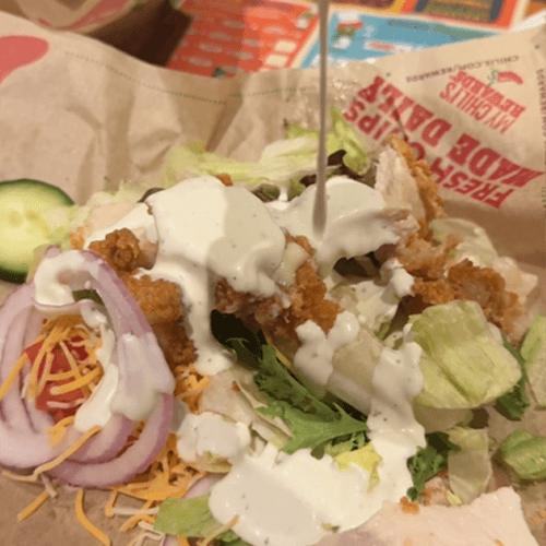 - My wife and i split the 3 for me so she got the salad and some fries and i took some chicken from my sandwich to make hers a chicken salad.