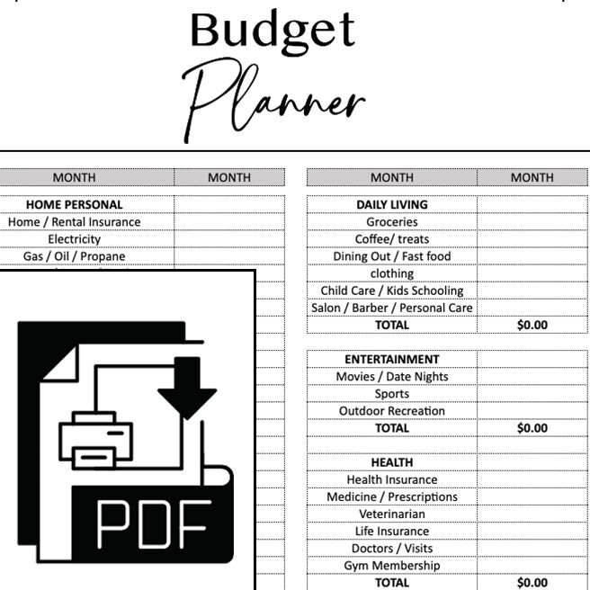 Monthly Budget Planner PDF Monthly Budget Planner PDF Was $4 Now $2 Sale Get a clear view of your monthly finances with our detailed Monthly Budget Planner PDF! This all-encompassing tool categorizes expenses across Home, Daily Living, Transportation, Entertainment, and Health, so you can manage each area of your budget with ease. From groceries and utilities to entertainment and healthcare, this sheet makes it simple to record, monitor, and adjust your spending. Ideal for anyone wanting to see exactly where their money goes each month, our Monthly Budget Planner helps you stay organized and financially empowered. Start making better money choices today! Enter an amount $ Add To Cart Buy Now