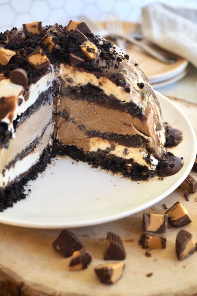 - Soften the coffee ice cream slightly for easy handling. Spread it evenly over the crust.